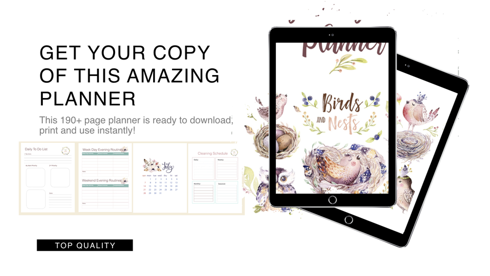 This is the perfect planner to plan and organise every part of your life. You'll find: monthly calendars, birthdays & anniversaries, password tracker, emergency contact info, address info, family events planner, books to read, movies to watch, places to visit, things to do, morning & evening routines, family agendas, teacher contact info, child info, daycare/sitter info, health stats and trackers, yearly goals, cleaning to-dos, roo by room cleaning lists, pet vaccinations, monthly reminders, budget planning, and so much more... 190+ pages of valuable planning and organising pages.